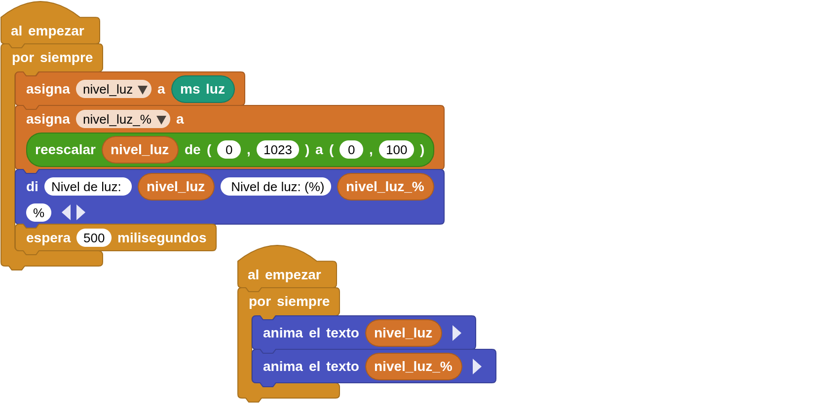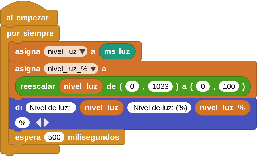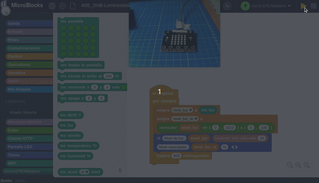 Medir la luminosidad visualizando el valor devuelto por el sensor LDR de la placa micro:STEAMakers (0 a 1023) y convertido a porcentaje.