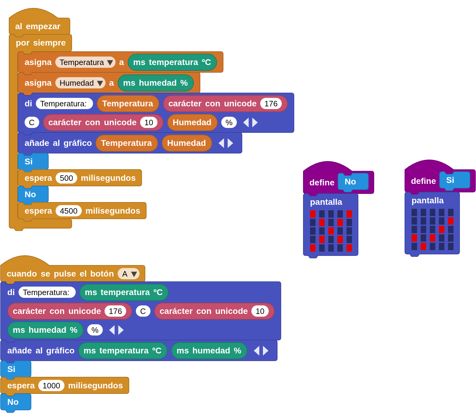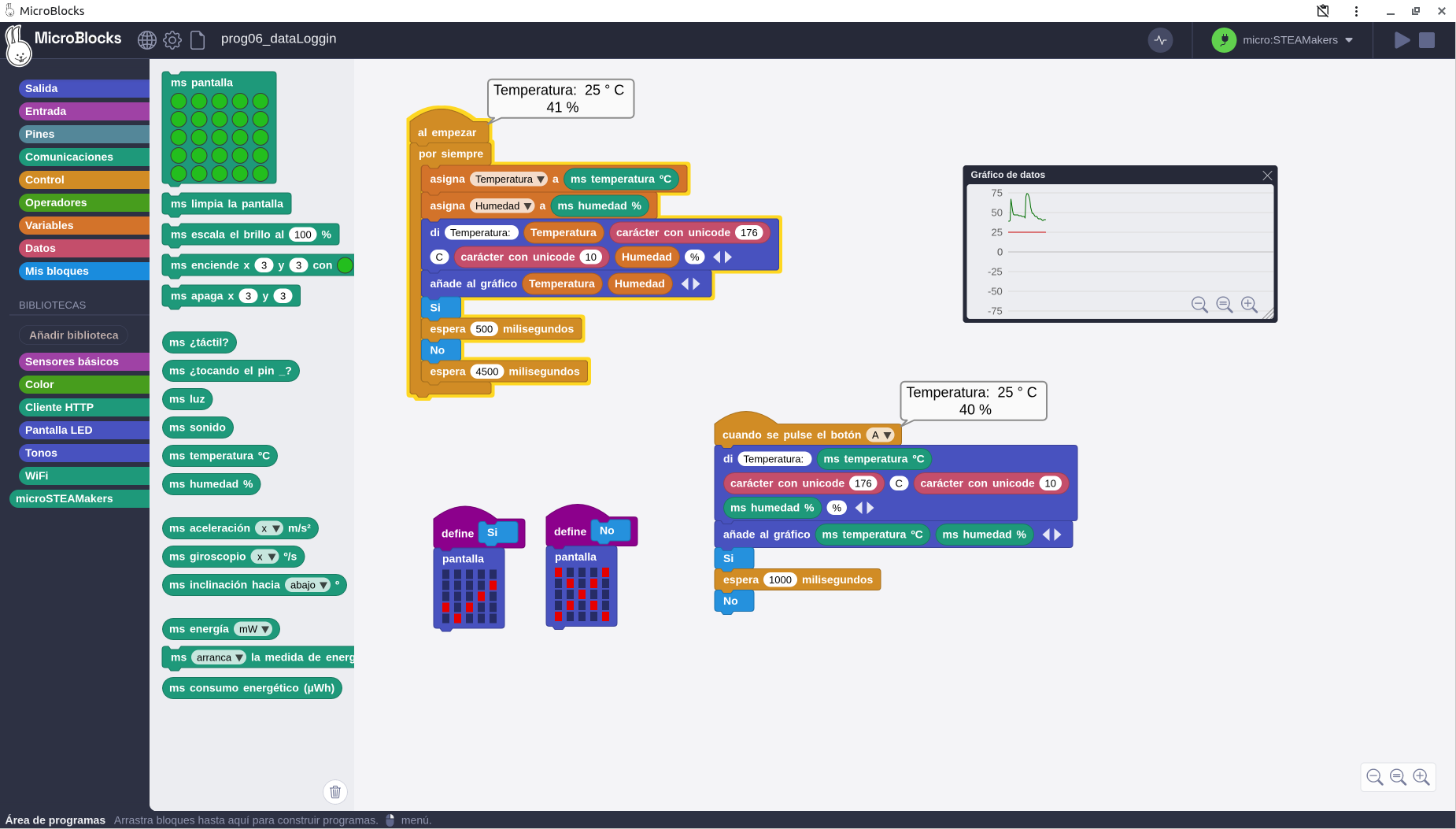 El programa va a captar un par de valores Temperatura/Humedad cada 5 segundos o cada vez que se pulse el botón A. Se irán mostrando gráficos según el instante en que se encuentra. Dos de los gráficos se han creado como funciones y se puede ocultar su definición.